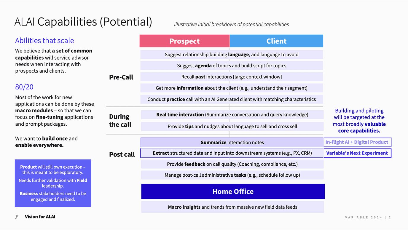 The core deliverable was a capability framework mapping every ALAI feature to advisor behavior across the call lifecycle — pre-call prep, live conversation, and post-call follow-through. This became the shared language between product, engineering, and the field, and the basis for roadmap prioritization.