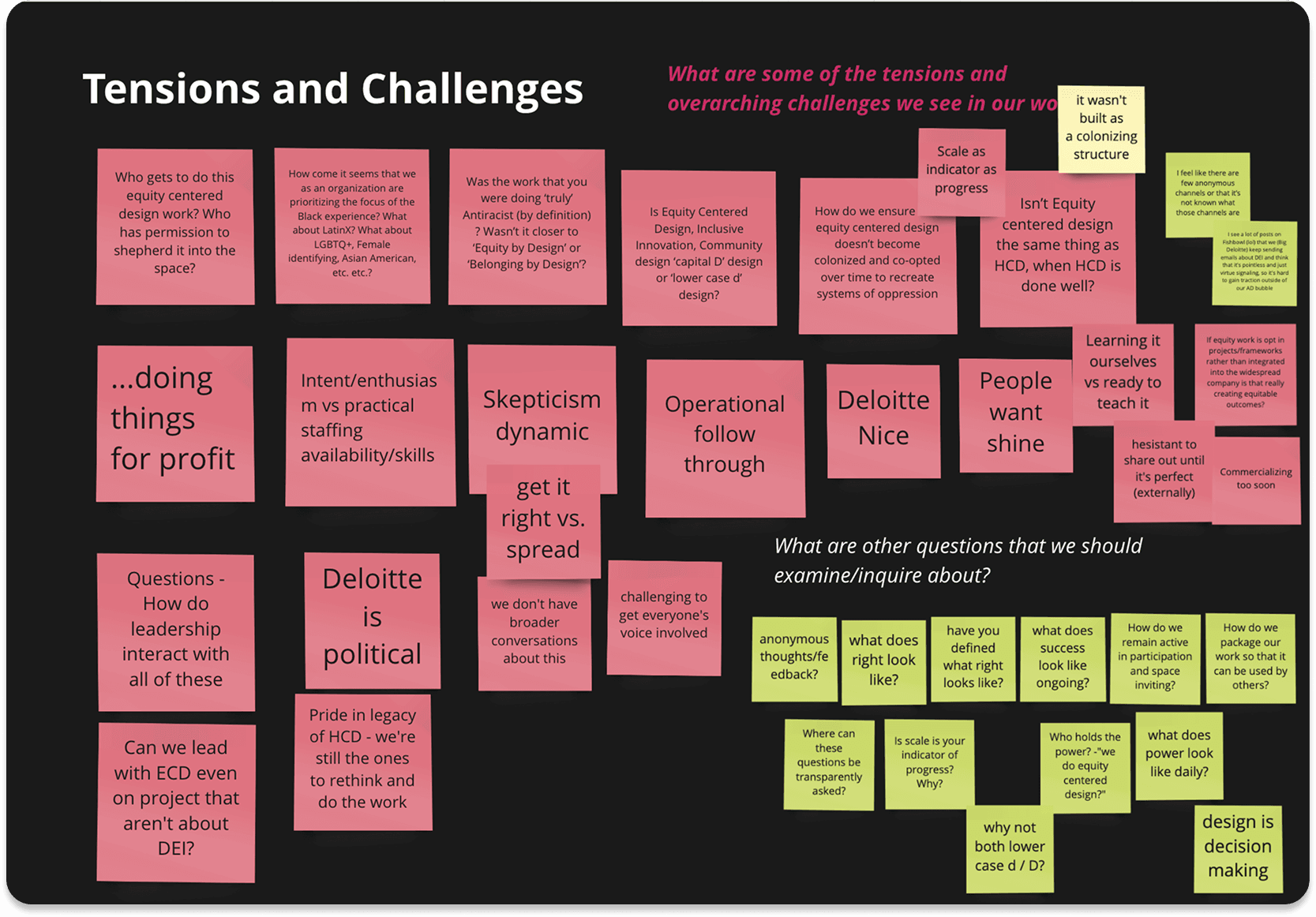 Human-Centered Design had become Deloitte's default and no one had questioned it in years. I did. I led a critical examination of whether our tools, methods, and research practices were actually serving the people they claimed to center or quietly reinforcing the same inequities we were hired to fix. What followed was a new design practice, Ethos: co-founded from scratch, built on new frameworks and field guides I designed, and delivered across healthcare, financial services, HBCUs, and social platforms. This is what design leadership looks like when the product is the practice itself.
