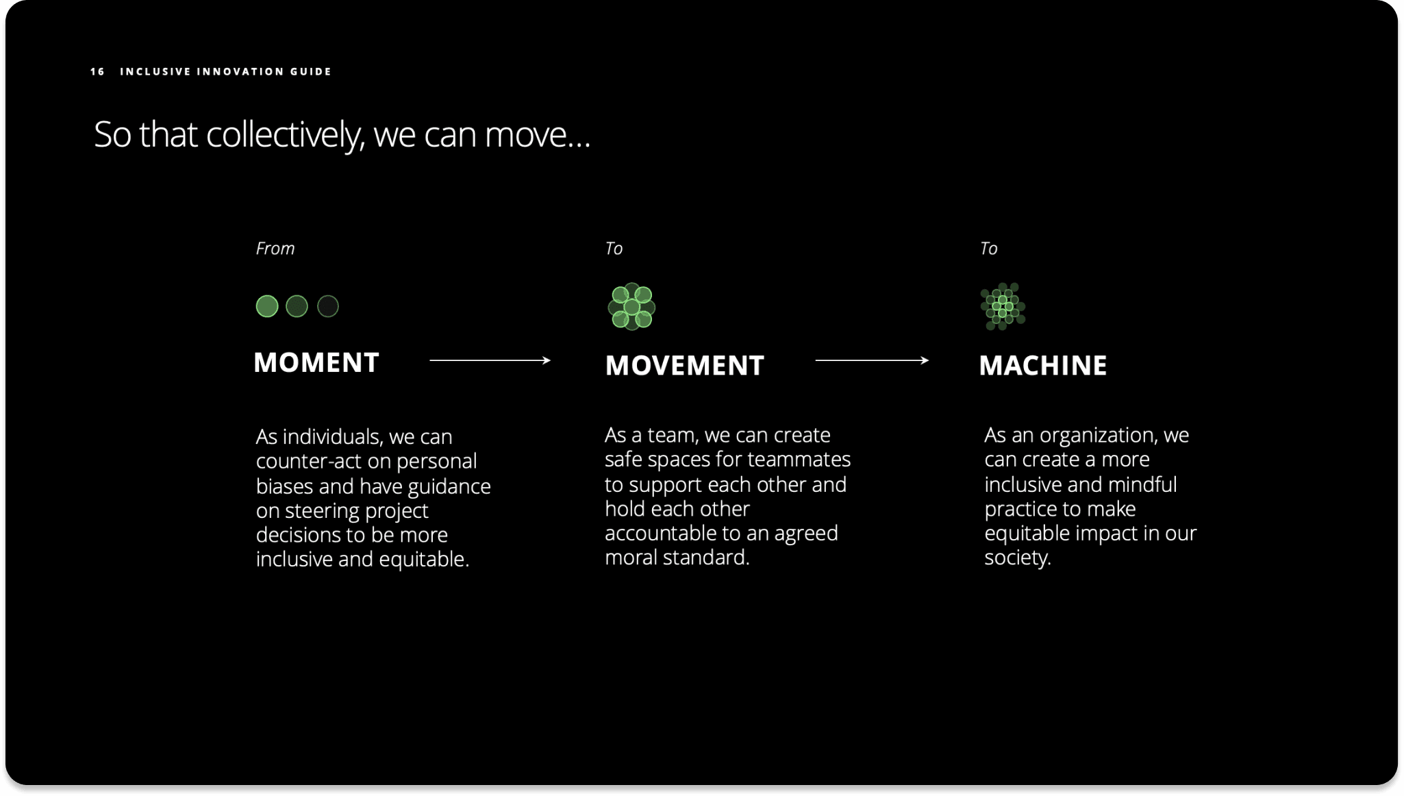 Artifact: Field guide empowering practitioners to center equity goals in client projects. Includes principles, tactics, and storytelling elements for internal and external stakeholders.