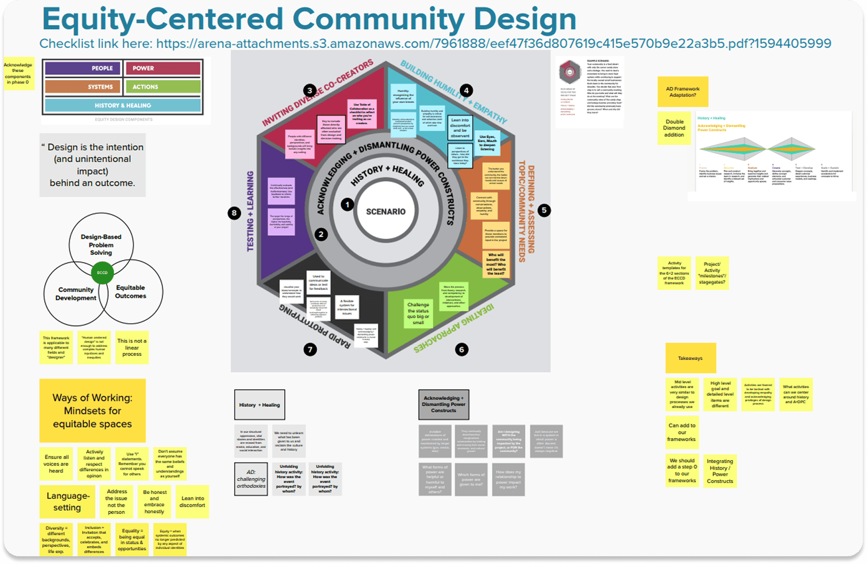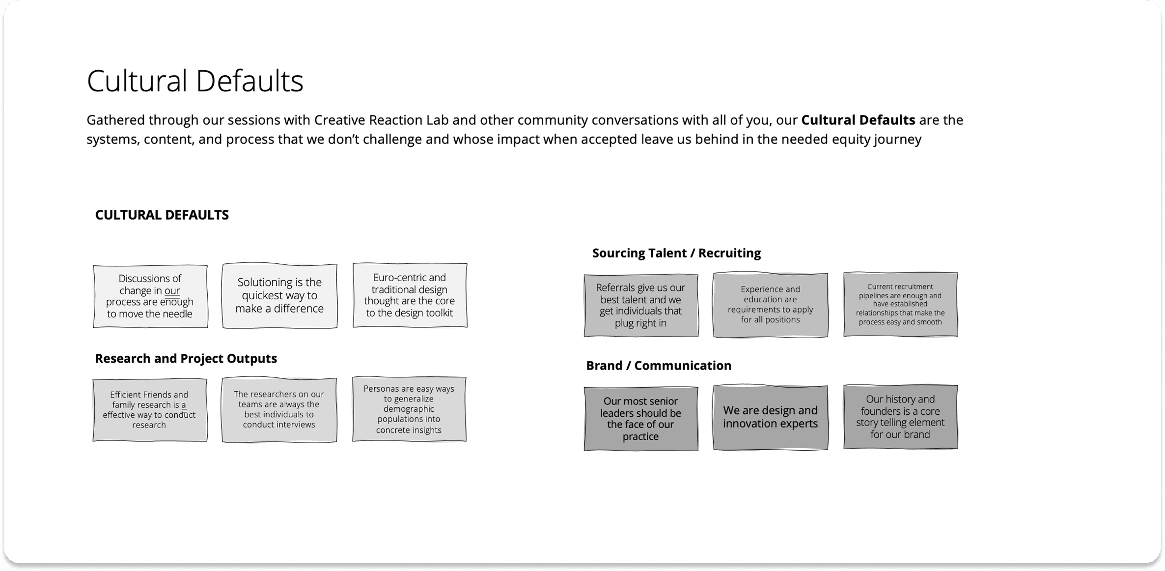 The field guide was the core design artifact, not a training document, but a practitioner experience. I designed it to work the way good design does: meet people where they are, give them a foothold, then expand their frame. Principles, tactics, and storytelling elements structured so a junior designer on a fast-moving project could center equity goals without slowing down or needing a workshop first. Designing how practitioners experience a methodology is design work, it just looks different than an interface.